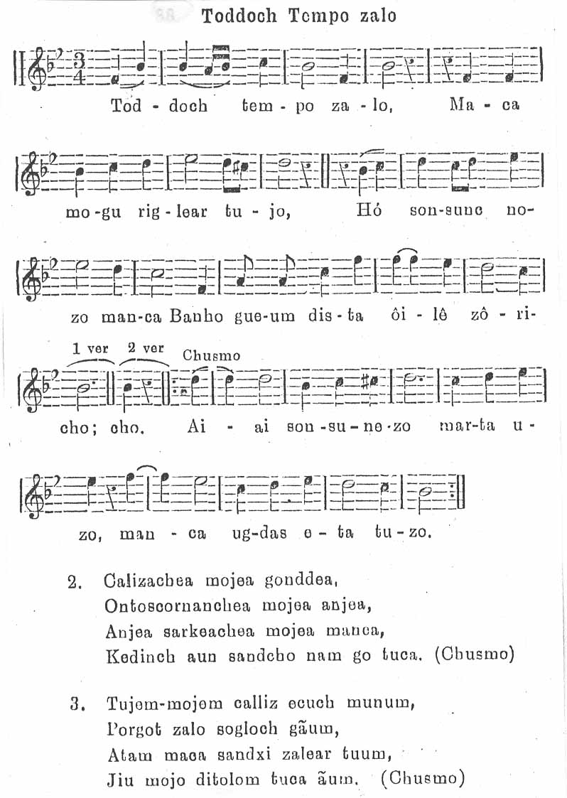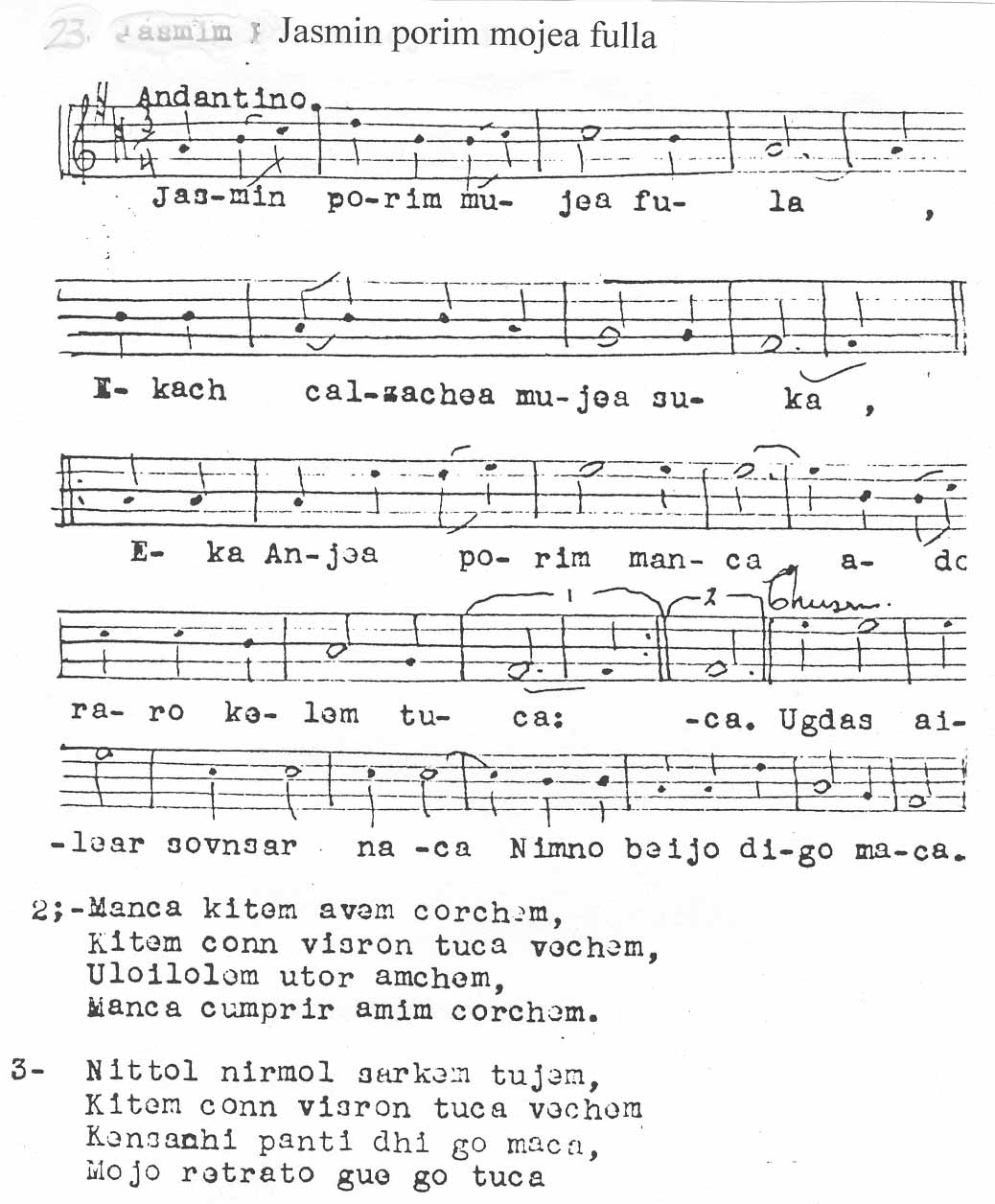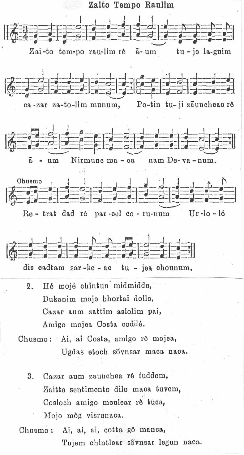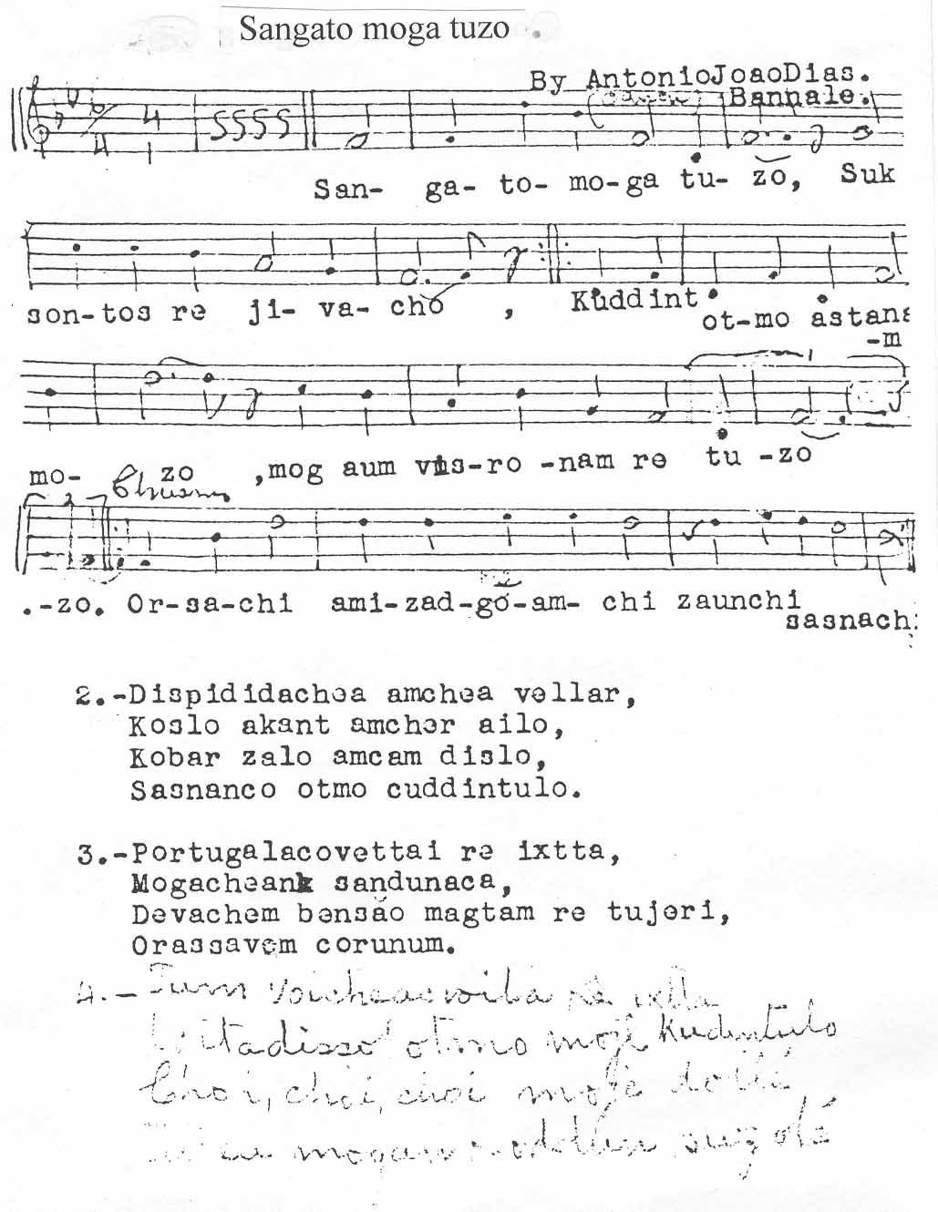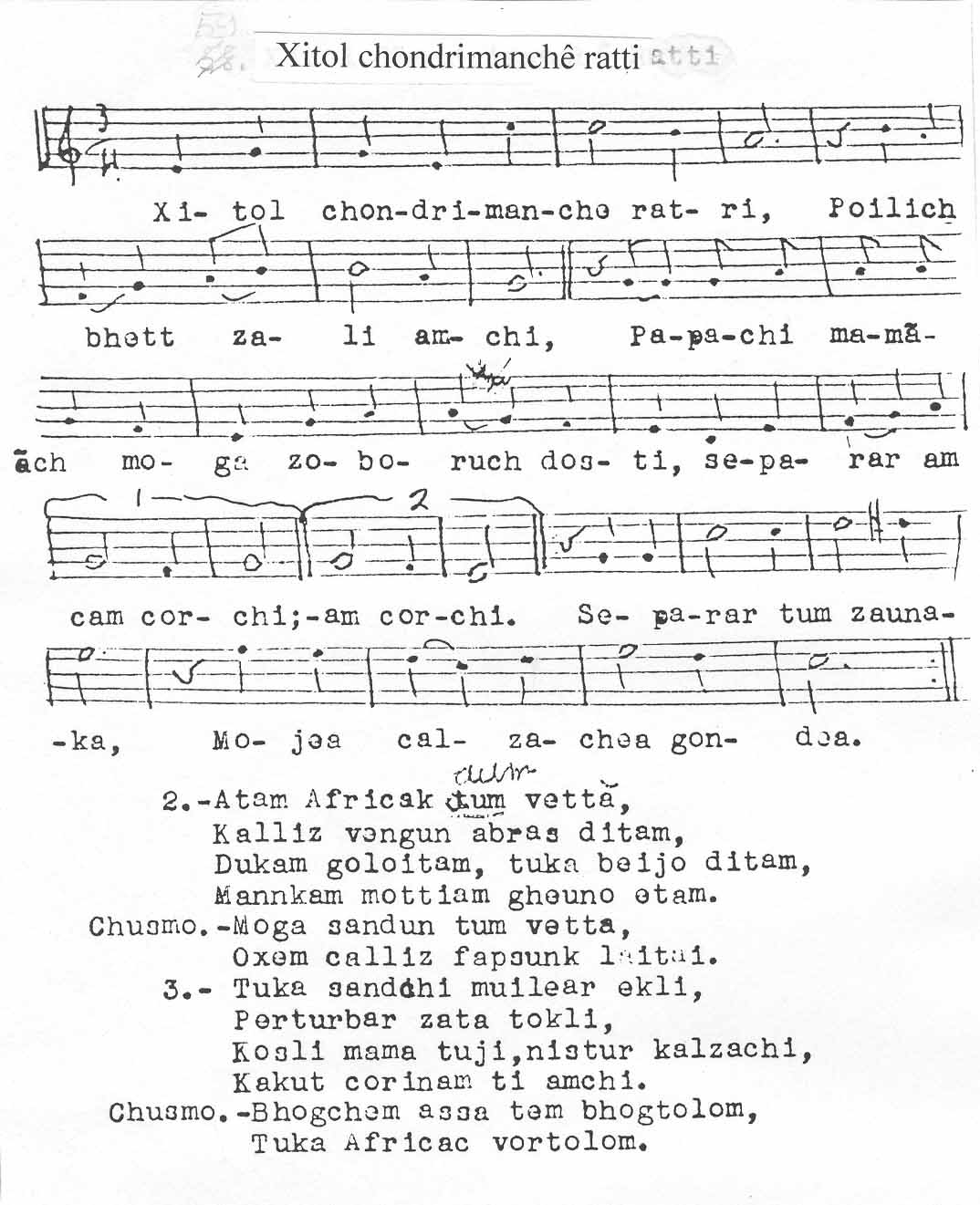 Mr. André Xett handed over the copyright to this anthology of dulpods and mandos personally to me in our home village Chorão, Goa. His son Mr. André Tiburcio Fernandes confirmed it in writing on 30th April, 2003. We thank them both for handing over this aspect of Goan culture to posterity. I would be only too happy if these songs are sung and find world wide circulation. The translation of these songs is to be found in the links "Dulpod" and "Mando".