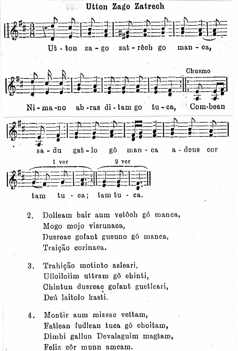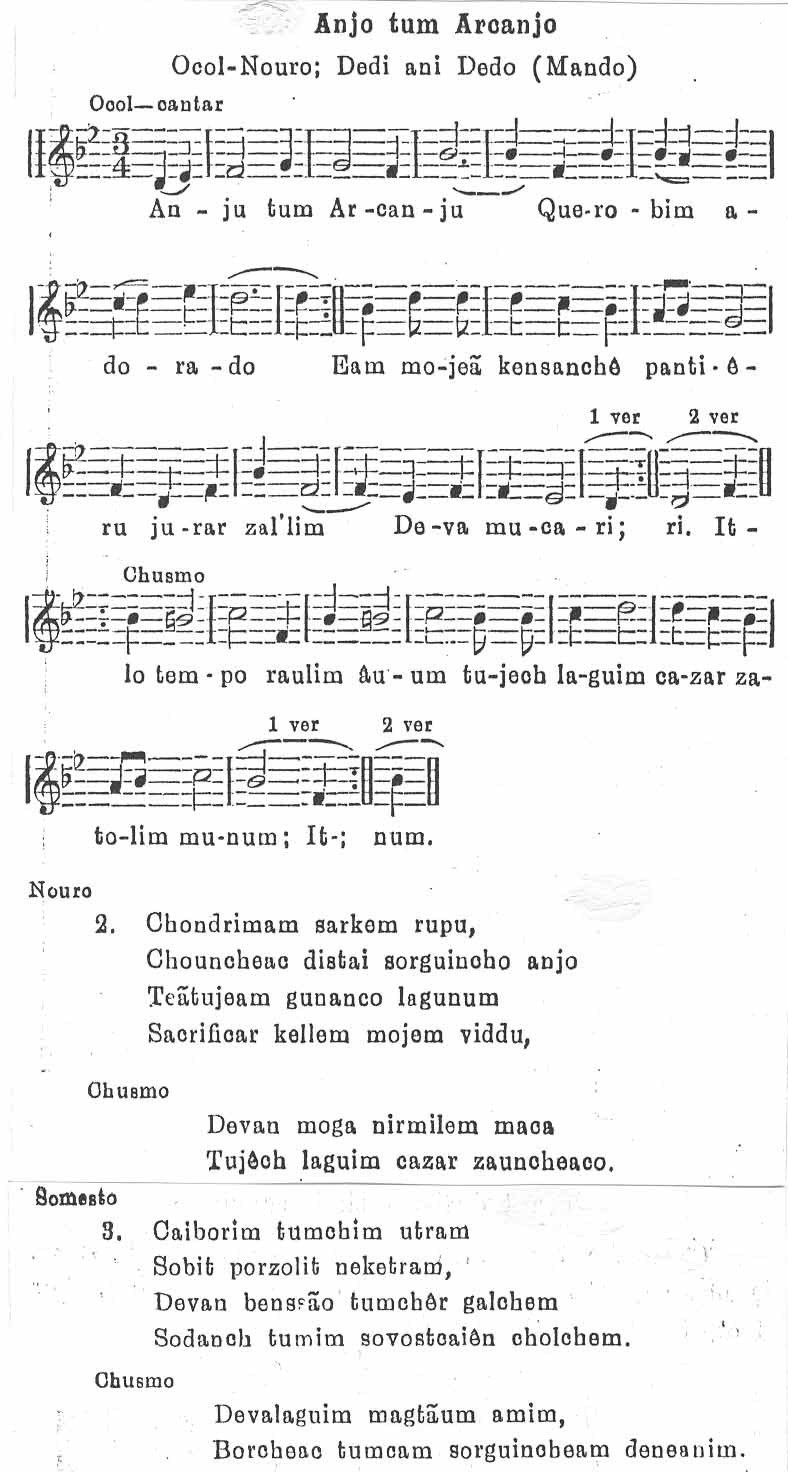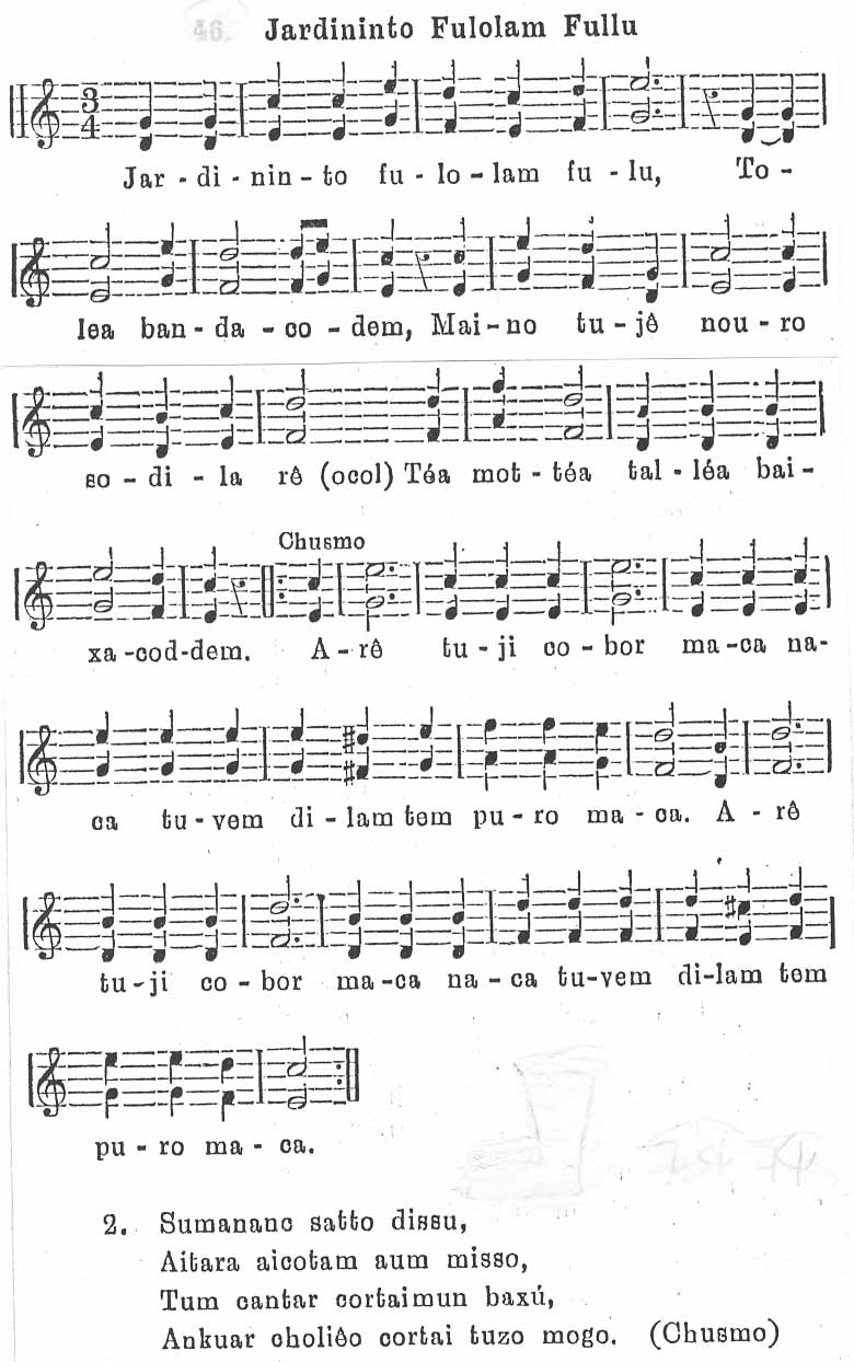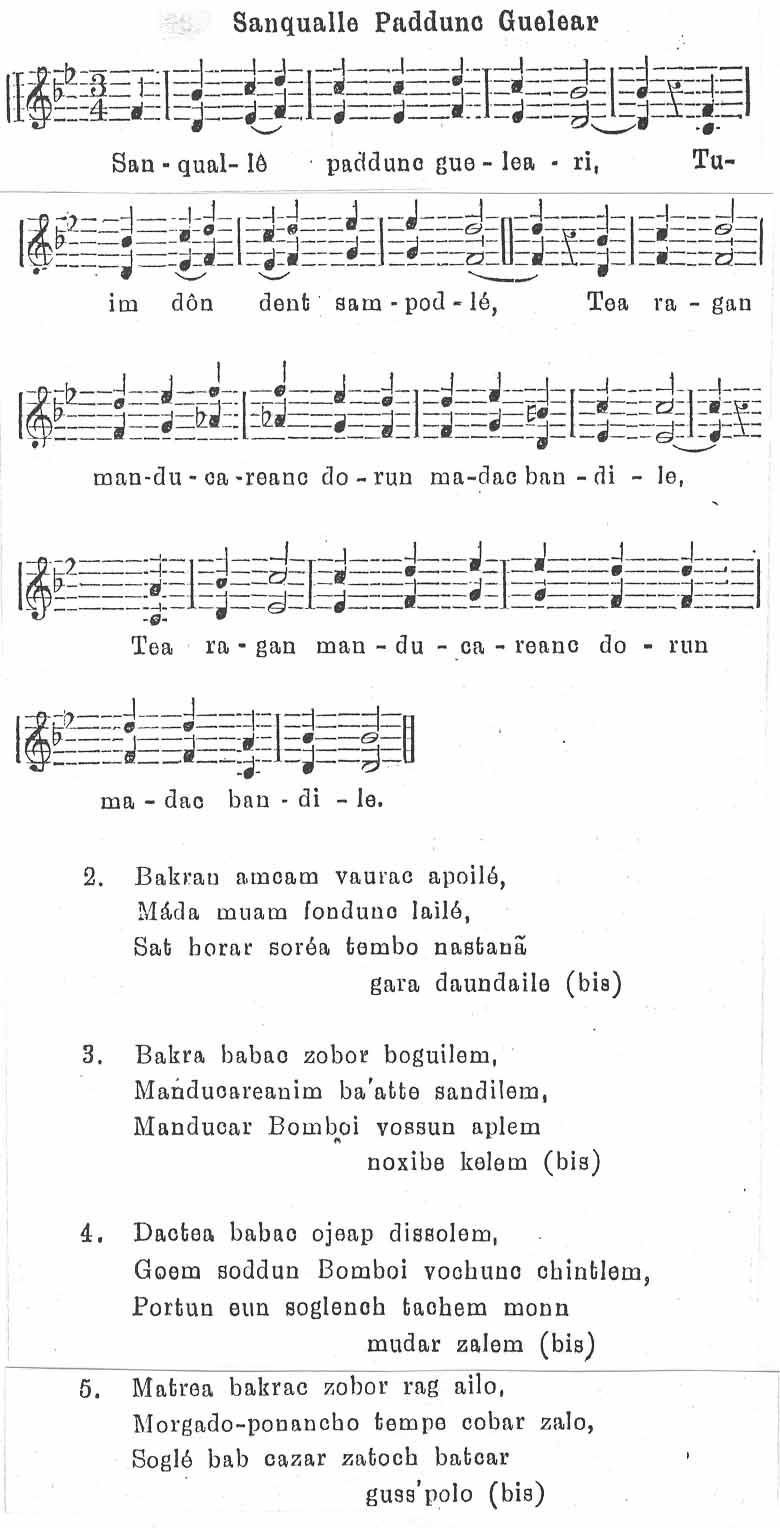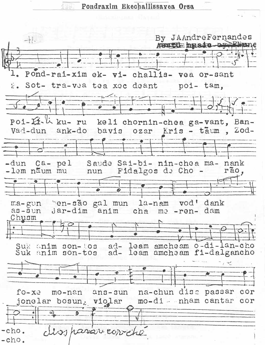 Mr. André Xett handed over the copyright to this anthology of dulpods and mandos personally to me in our home village Chorão, Goa. His son Mr. André Tiburcio Fernandes confirmed it in writing on 30th April, 2003. We thank them both for handing over this aspect of Goan culture to posterity. I would be only too happy if these songs are sung and find world wide circulation. The translation of these songs is to be found in the links "Dulpod" and "Mando".